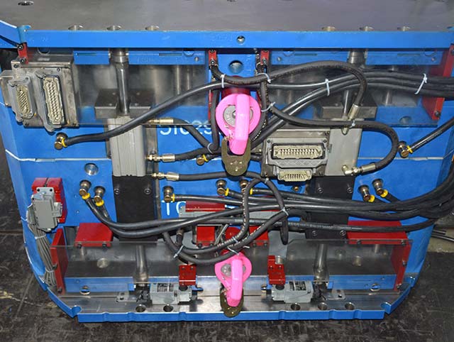 BMW end cap 1000T大型雙色模具,前模頂出需要開模同時沿分型面頂出,合模需要分型面推前模頂出系統回位,經過我們工程團隊前期跟客人提出的有效建議對產品的優化,結果模具試模一次成功。